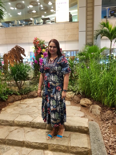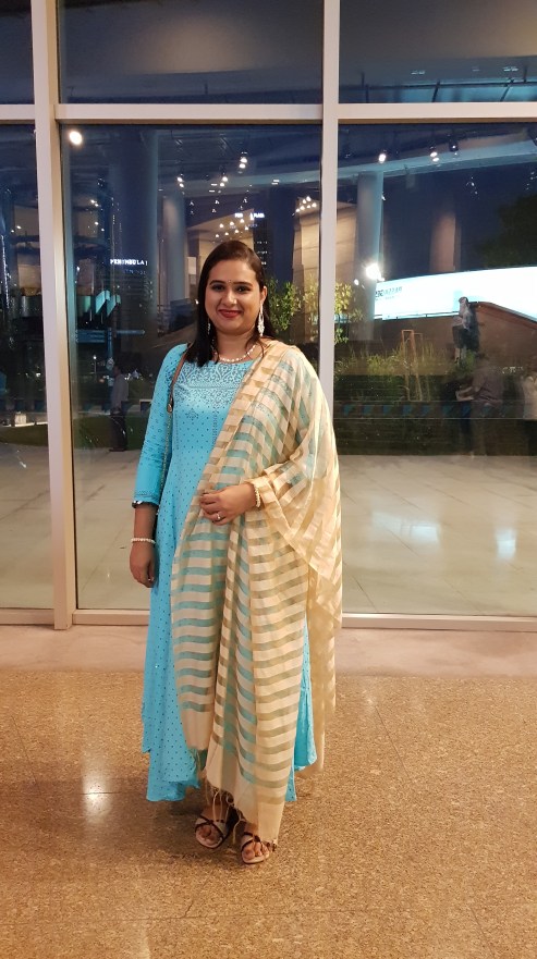Dress 2: This dress is Indo-Western and I bought it at Lifestyle Stores (Brand: Snap). I love the shade of blue and especially the way the dress falls and flows. I paired it with a golden shawl/stole from Westside Stores, heavy Indian earrings and red lips. It was perfect for an evening concert at the beautiful Esplanade Theatres in Singapore.