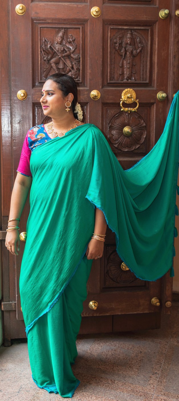 Fast forward, I am back to loving sarees and especially the new (revival of the old styles) styles that is happening right now – Kalamkari, plain ones, double-colour, cotton, handloom etc. When we can go organic and eco-friendly with our food, why not with our clothes right??!