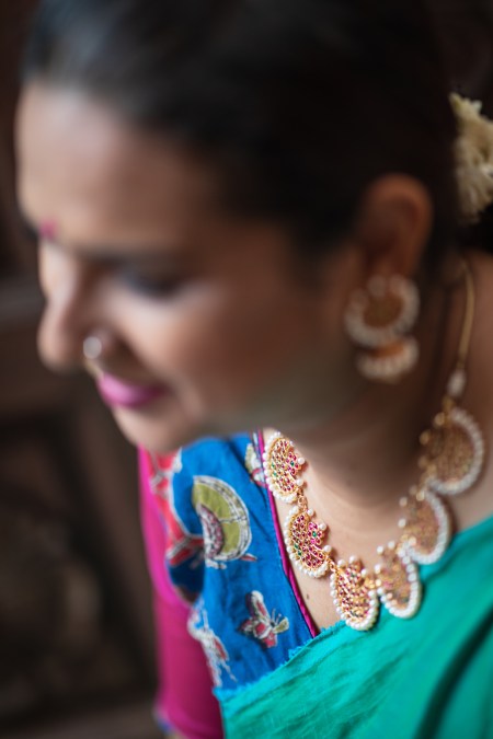 I paired this beautiful blue-green plain saree with a colourful kalamkari blouse; the saree has super cute tassels at the end too :). To add to the fairytale outfit, I wore the beautiful half moon earrings and necklace set from Quills & Spills. Topped it off with a bun and fresh flowers, huge bright pink bindi, pink and gold makeup, simple bangles – and I was all gorgeous for my friend’s engagement function in a temple. I love this look and love the brands that made me put this look together.